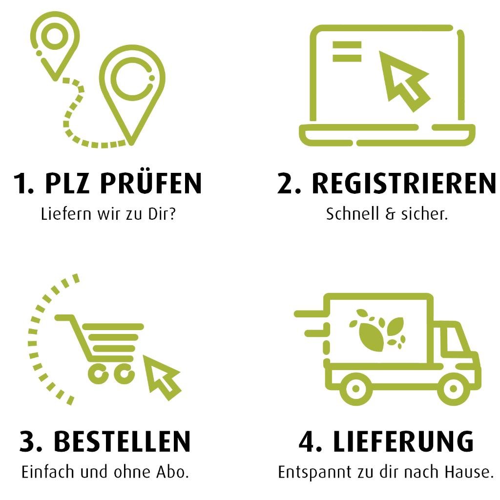 Lege dir zuerst ein Kundenkonto an. Klicke dafür auf die Figur oben rechts und registriere dich als Neukund*in. Bitte fülle die Anmeldung vollständig aus und bestätige diese. Jetzt kannst du in unserem Online-Shop deine gewünschten Produkte aussuchen und in "die Kiste" legen. Am Ende deines Einkaufs kannst Du deinen Liefertermin auswählen und schickst die Bestellung ab. Für unsere Mehrweg-Lieferkiste berechnen wir 5 € Pfand, die Du zurückbekommst, sobald wir die Kiste wieder abholen.