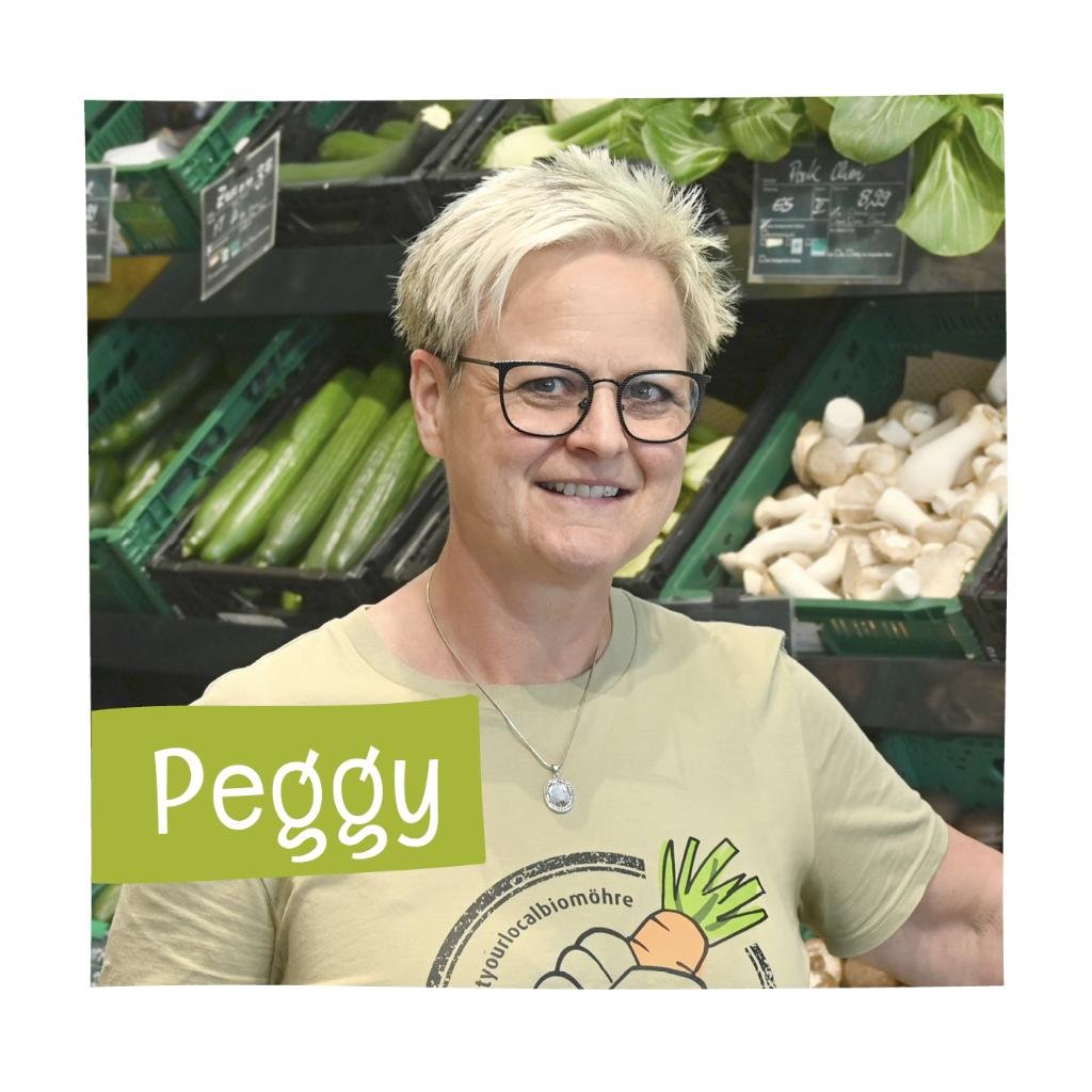 Peggy sorgt mit ihrem Strahlen für gute Laune. Die bunte Obst- und Gemüseauswahl und besonders der Duft der frischen Früchte gefallen ihr besonders gut. Da kommt es der leidenschaftlichen Chorsängerin schon mal vor, dass sie im Laden anfängt zu singen.